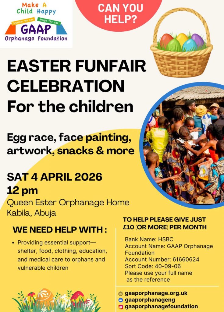 GAAP is running one of our dedicated engagements this Easter on 4th April at the Queen Esther Orphanage and Charity home. It will be a day for the children at the home with games including face painting, drawing, Easter egg hunting and more! Please help us by donating towards the activity.